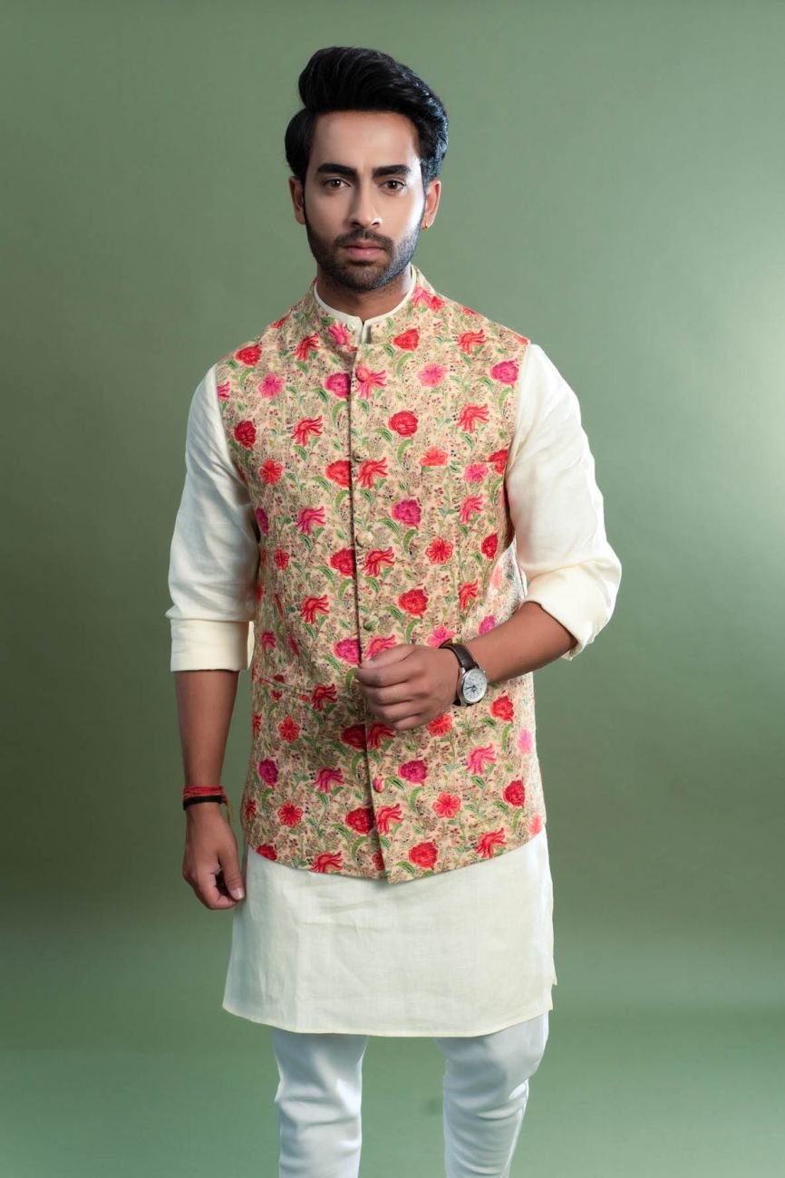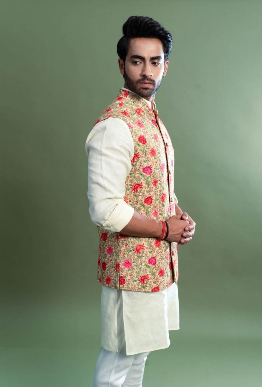Mens Cream Kurta Pyjama with Ethnic Nehru jacket Set