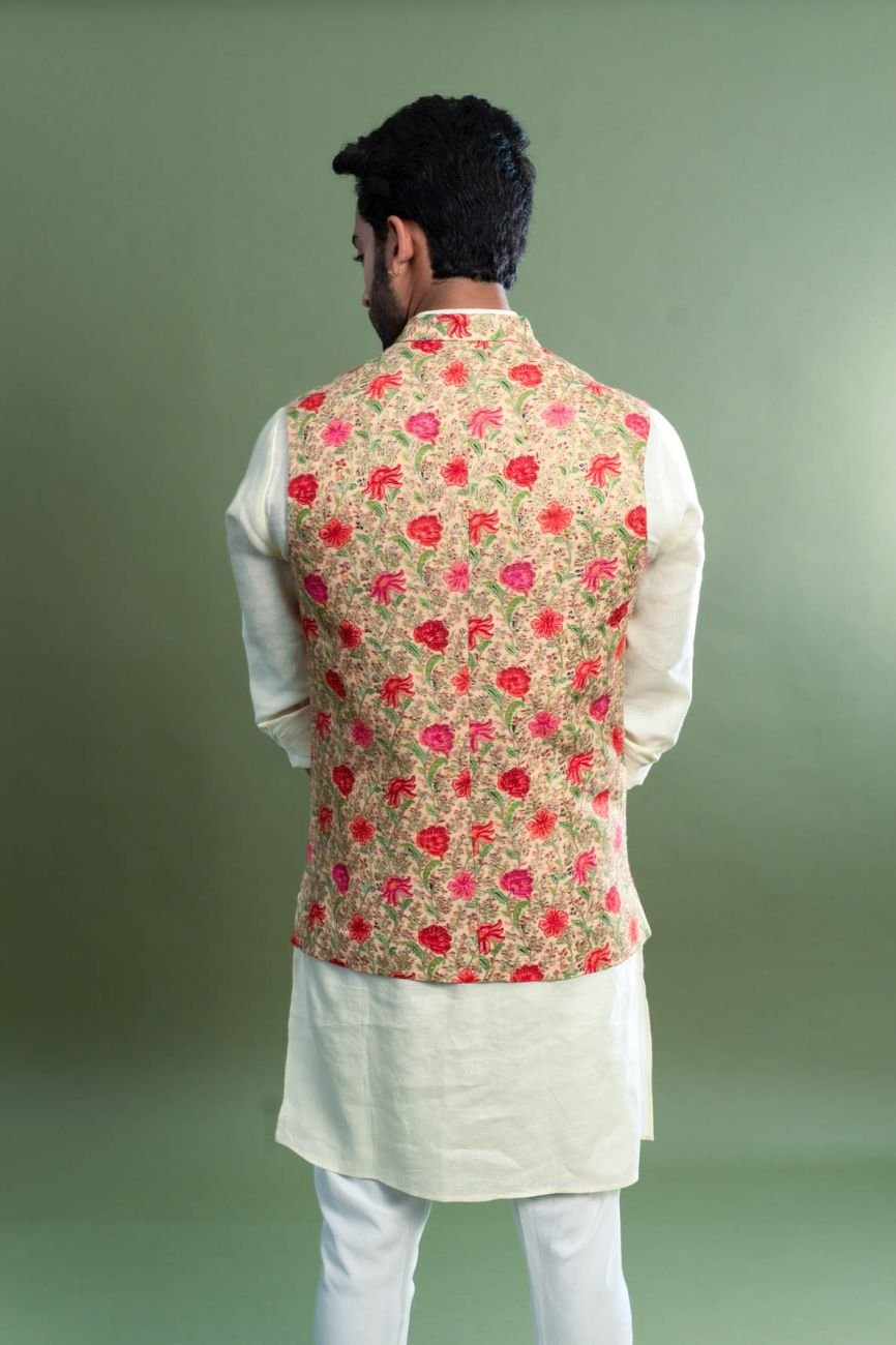 Beige With Multicolor Embroidered Silk Kalamkari Nehru Jacket
