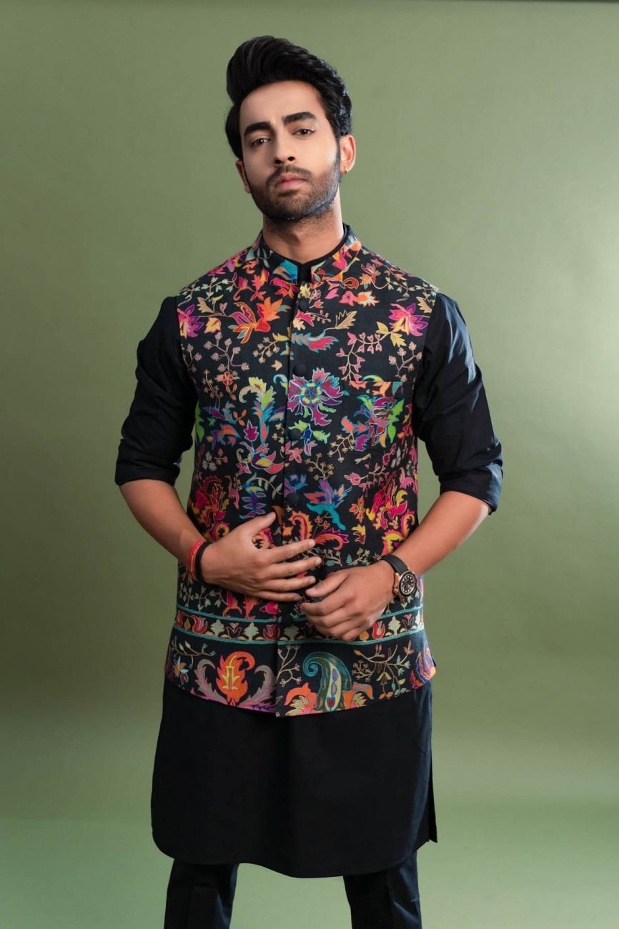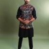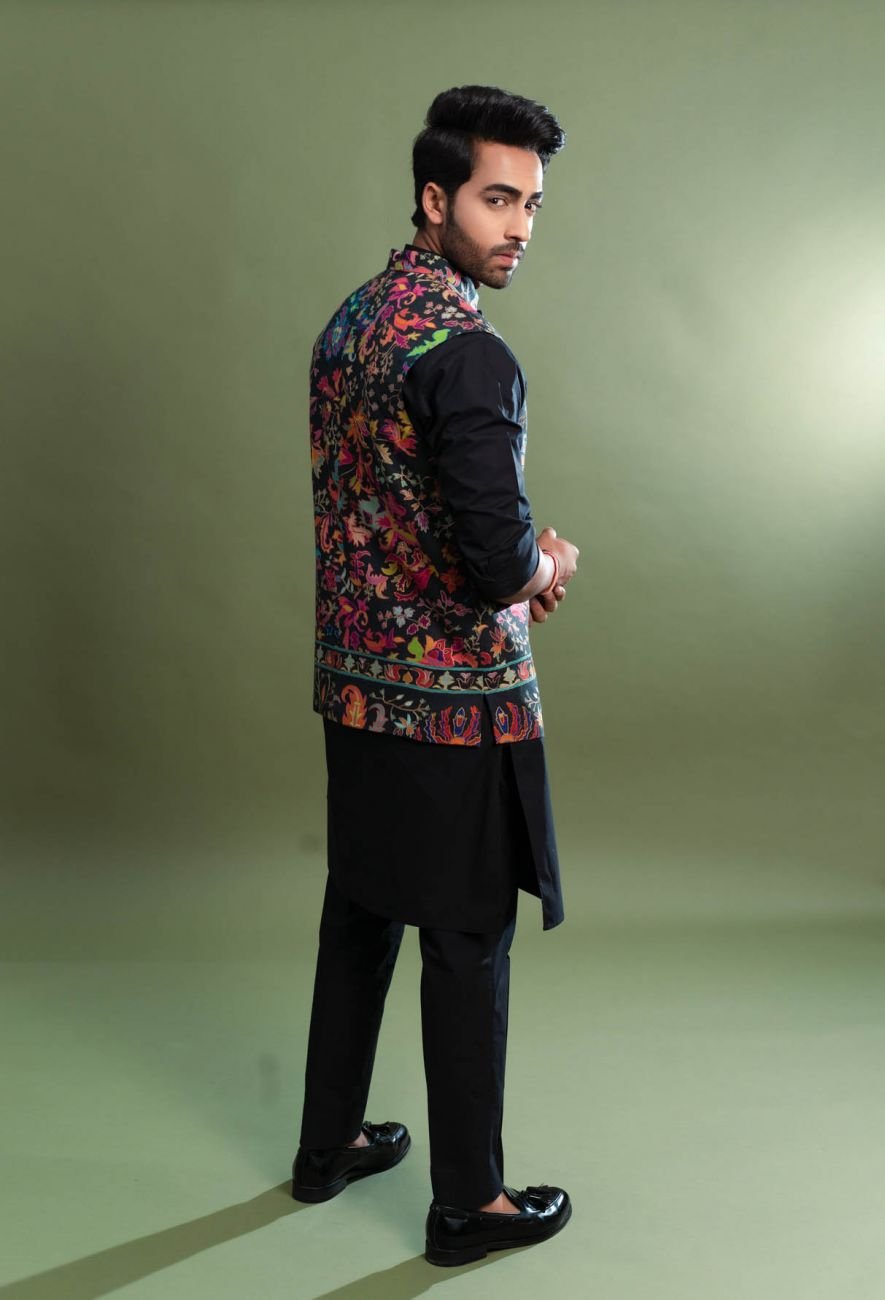 Black With Multicolor Handwork Embroidered Silk Kalamkari Nehru Jacket