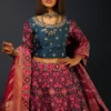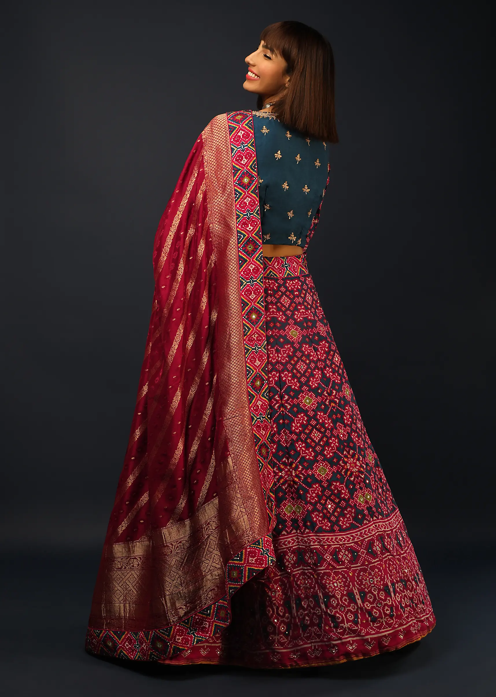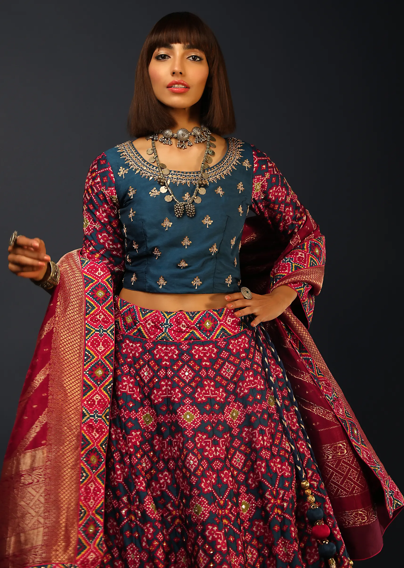 Deep Blue Lehenga In Silk With Maroon Patola Print And Ready Stitched Blouse