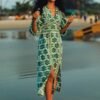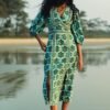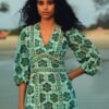 Crafted in our floral tile print, this dress is designed with a plunge neckline and 3/4th puff sleeves